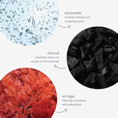 配方蘊含活性備長炭,可以吸附過剩油脂及污垢,淨化毛孔;加上維他命B3 (Niacinamide,又稱煙酰胺)、紅藻和刺雲實果萃取,形成具抗敏及抗衰老功效的防護網,防止空氣污染粒物積聚,並保護肌膚天然脂質屏障。