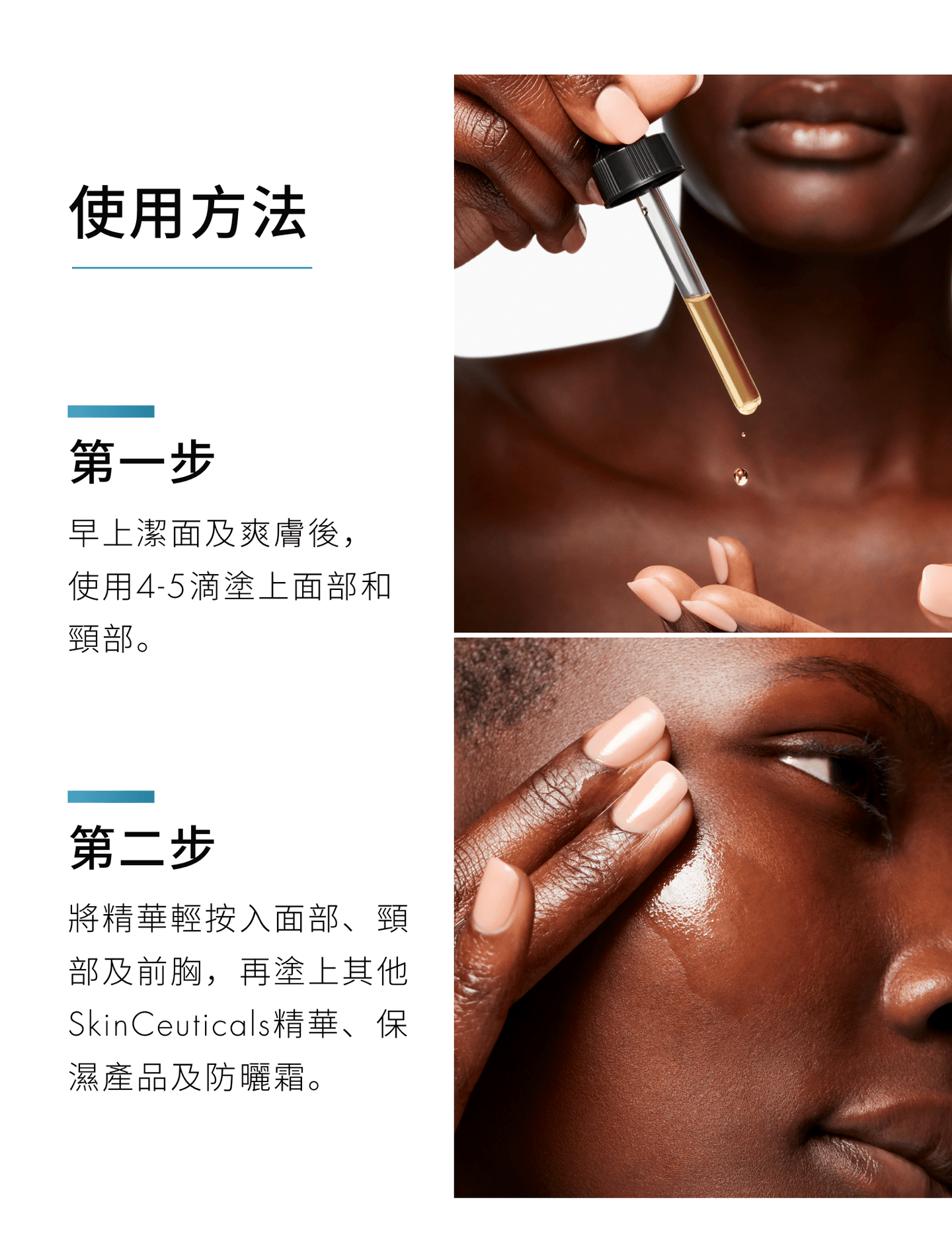 早上潔面及爽膚後,使用4-5滴塗於面部、頸部和前胸。