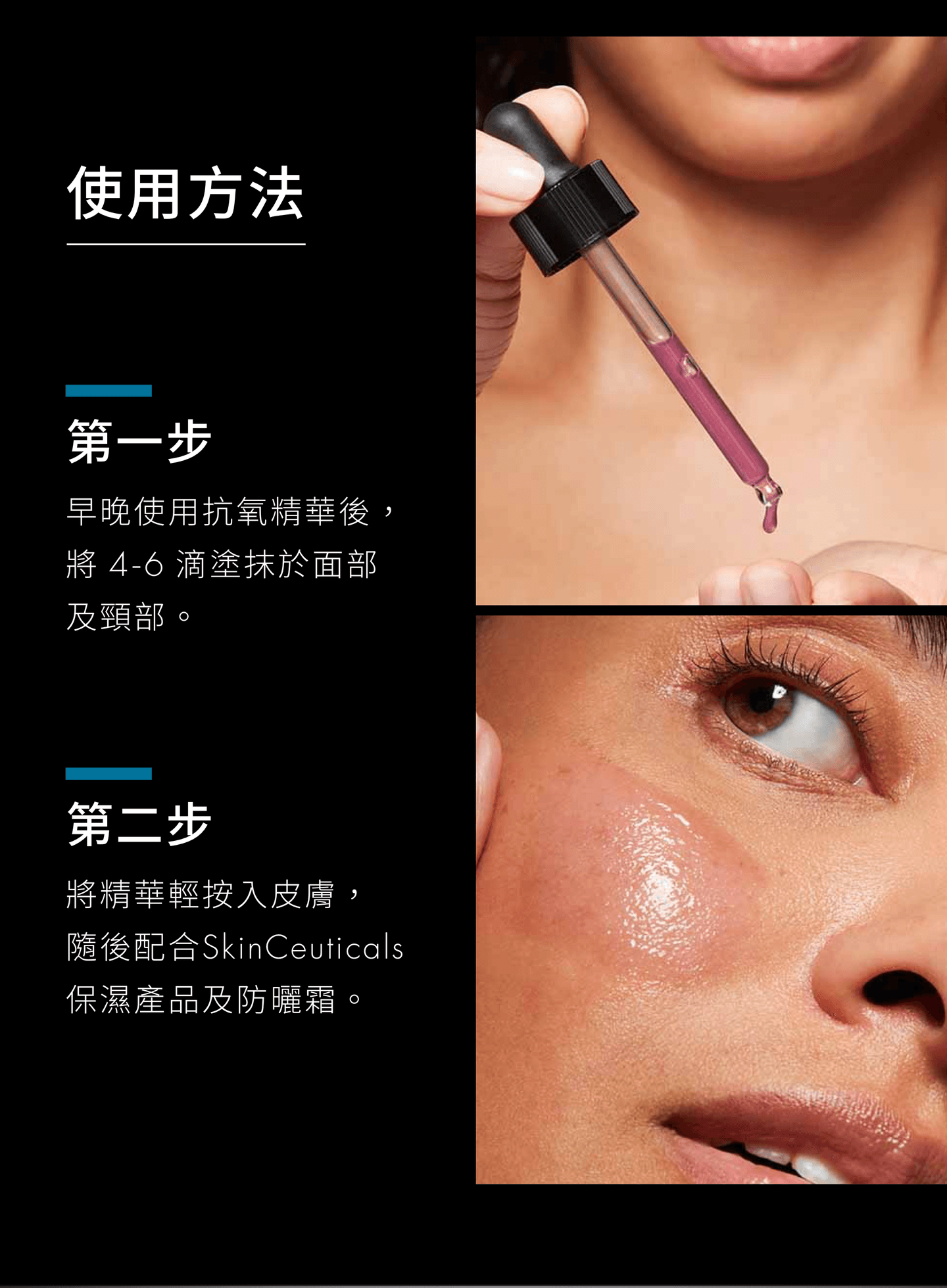 早晚使用抗氧精華後,使用4-6滴塗於面部及頸部。