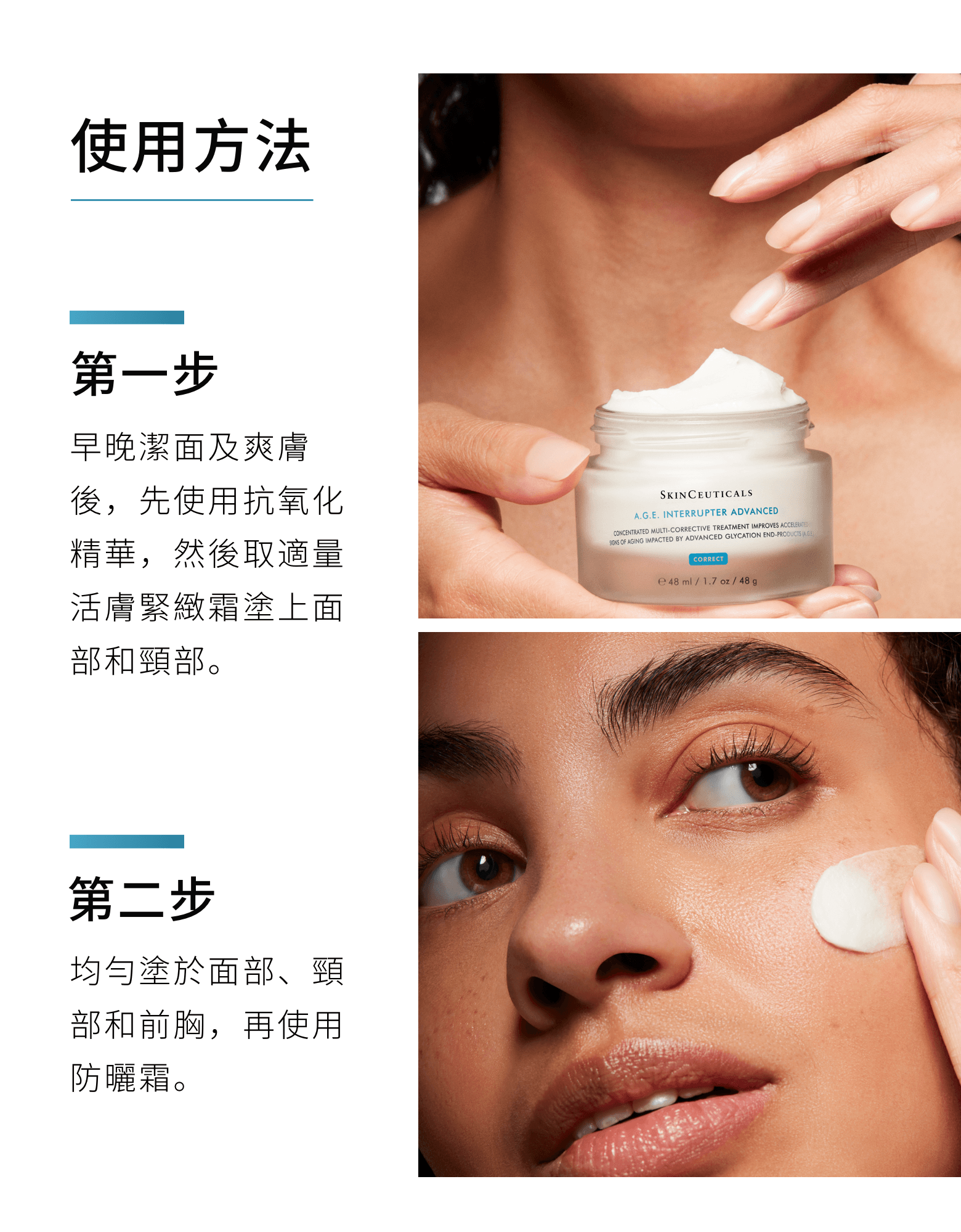 每天使用兩次,薄塗於面部、頸部和前胸,輕輕按摩。早上請於SkinCeuticals抗氧化精華後和防曬霜前使用。如晚上與維他命A配合使用,請於維他命A後塗抹。