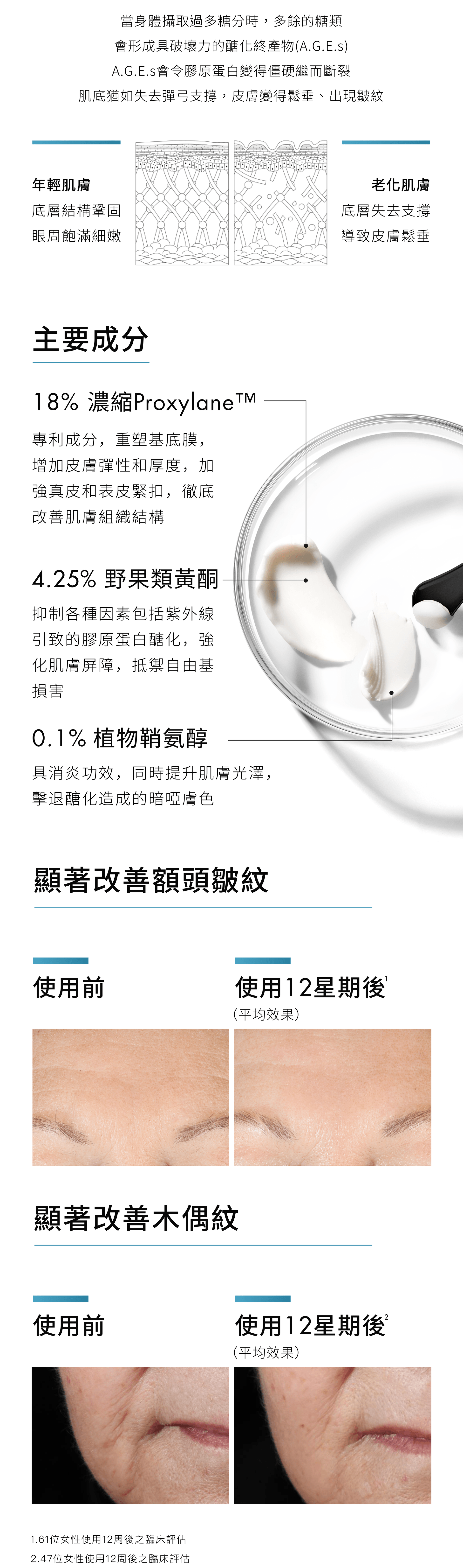 18% 濃縮專利抗皺因子Proxylane™:令肌膚底層更飽滿豐盈,同時改善表層的老化跡象,如皺紋和鬆弛。